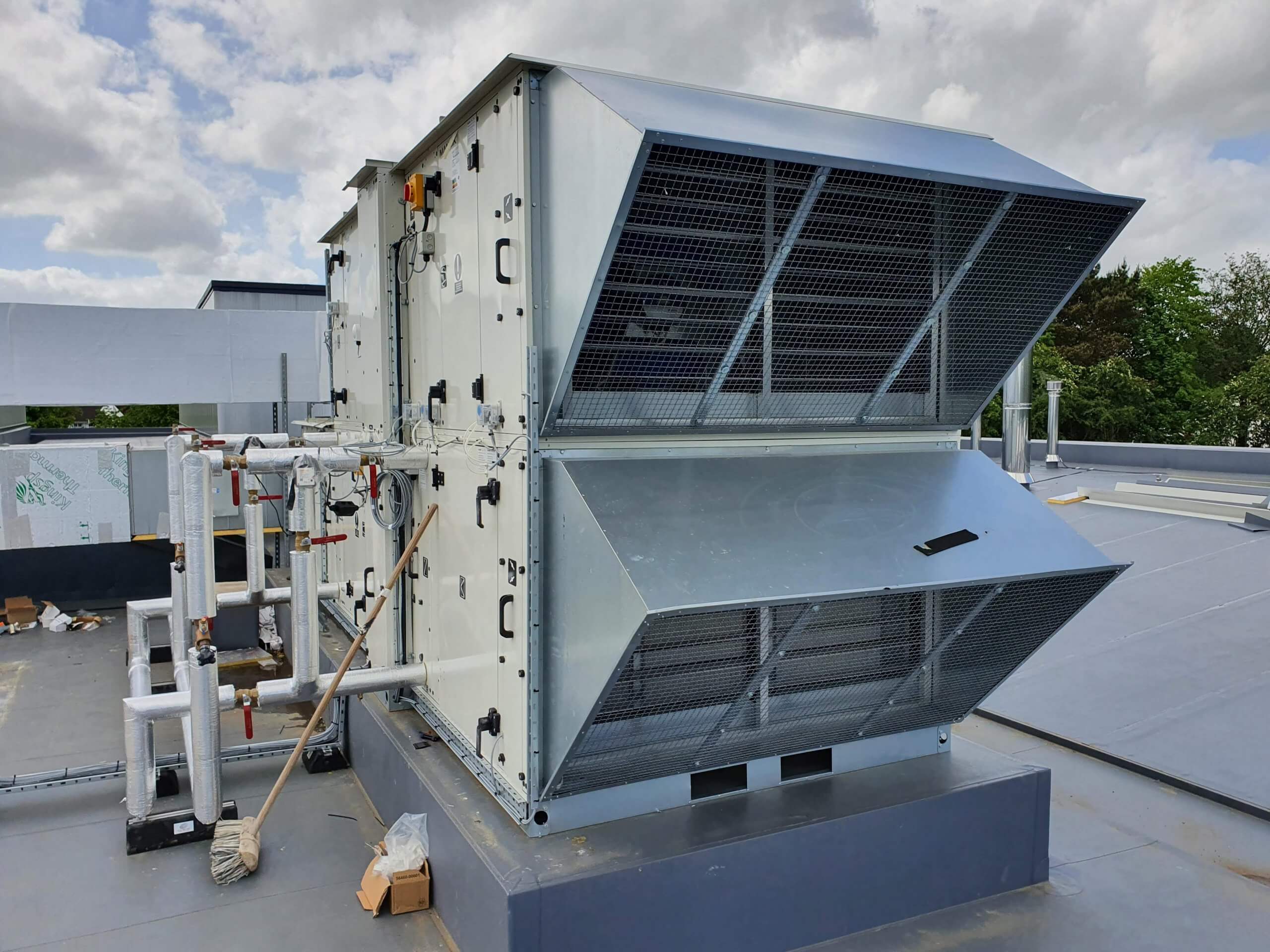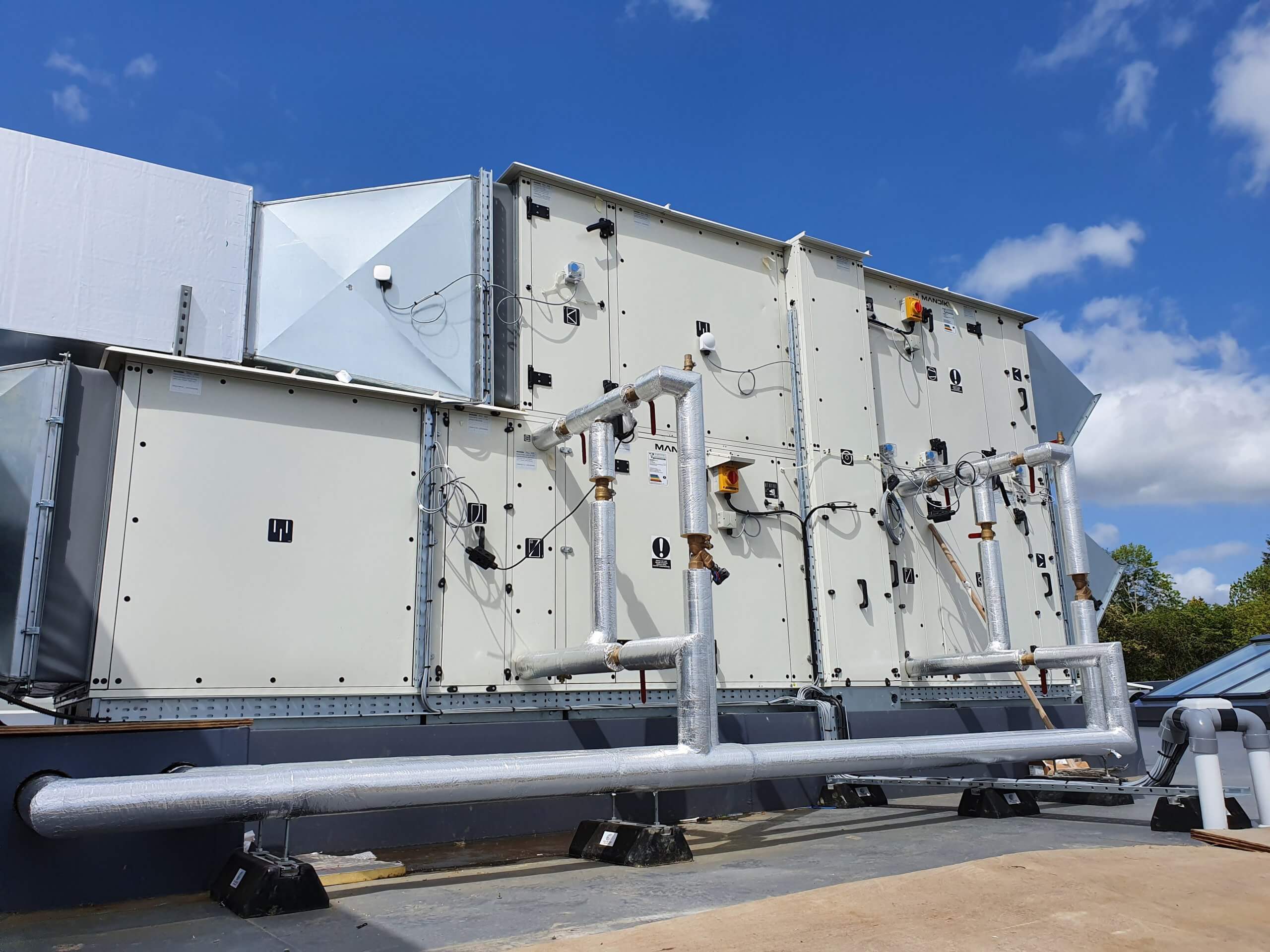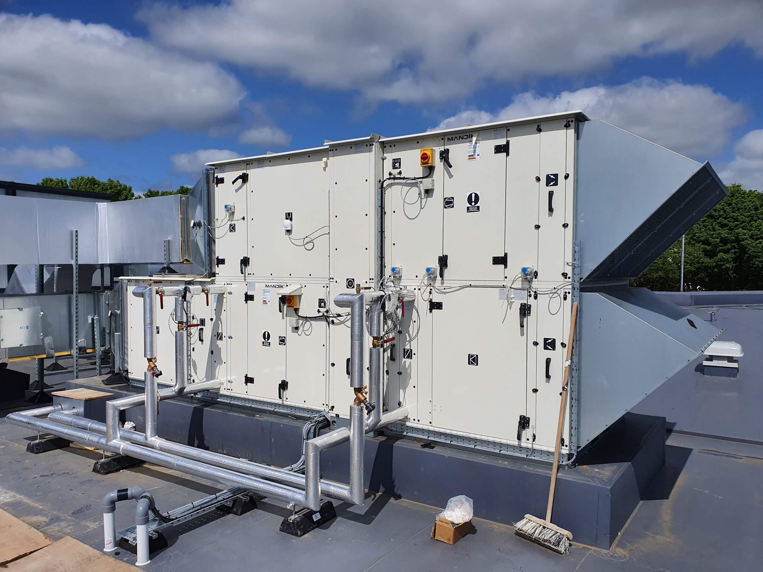 The larger unit is a double decked supply and extract unit with thermal wheel heat recovery, whilst the smaller unit is a supply only unit. Both units also feature LPHW frost and heating coils, motorised shut off dampers and M5/F7 filtration. The units have a powder coated finish to the external panels for extra corrosion resistance.