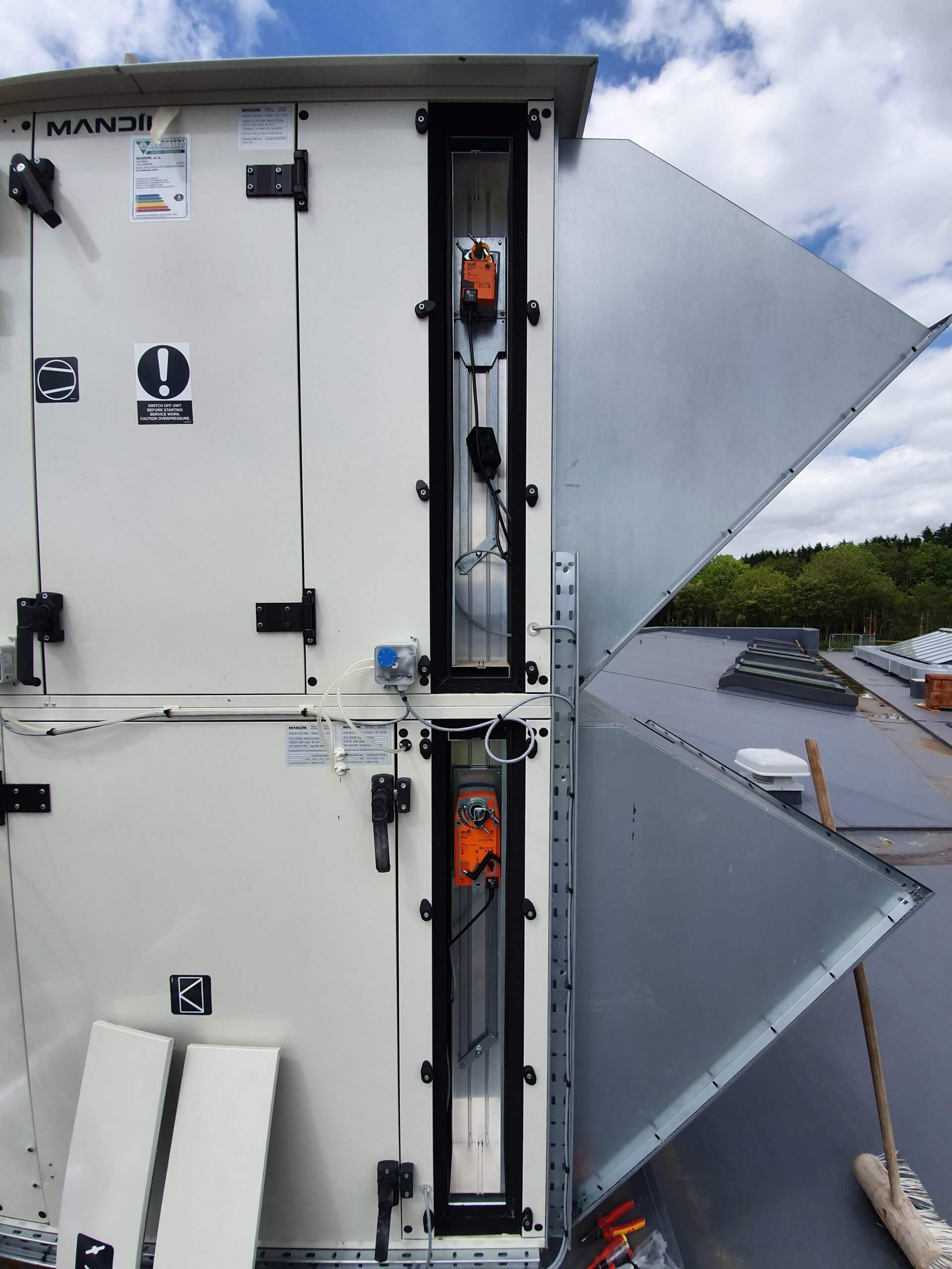 Fairhaven recently completed the commissioning of two Mandik AHUs supplied for a brand new school building for Braidside Integrated PS in Ballymena. The units, both outdoor mounted in full weatherproof trim, are fitted with Ziehl Abegg C-Pro direct drive fans with “ECblue” motors for energy efficiency and controllability.